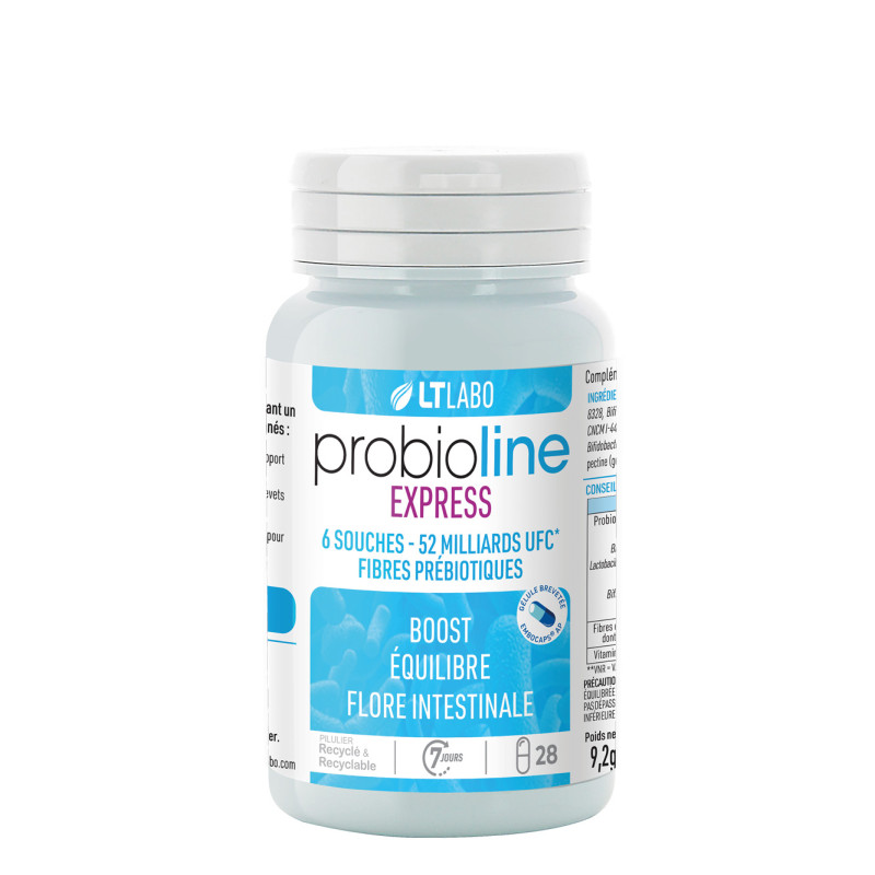 Probioline Express évolue avec une nouvelle formule enrichie en 6 souches de probiotiques complémentaires, pour un total de 52 milliards d’UFC par jour*, combinées à un prébiotique naturel puissant : la gomme d’acacia titrée à 90 % de fibres. Grâce à sa technologie brevetée Embo Caps® AP60, cette formule garantit une libération ciblée des probiotiques dans l’intestin, là où leur action est la plus efficace.